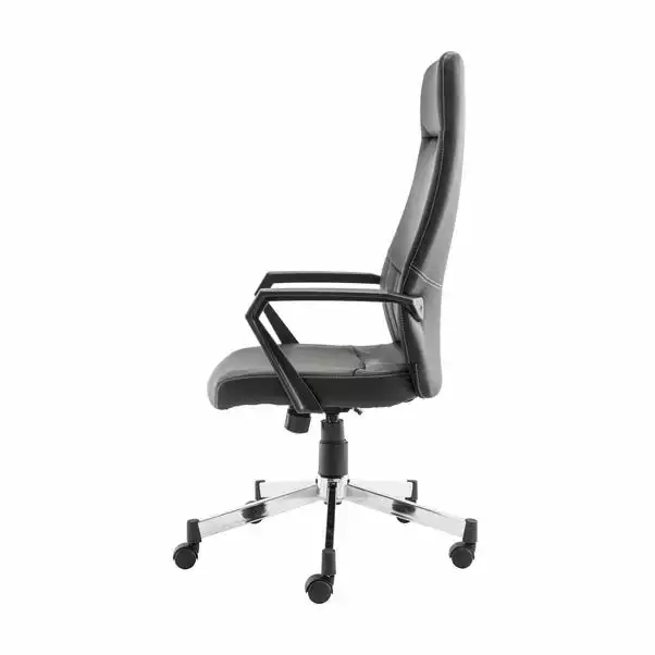 Designed with both style and comfort in mind, the Brooklyn high back office chair features a contemporary design boasting a mix of curved edges and striking angled legs and armrests. The ergonomically shaped back and headrests and foam padded seat are upholstered in a black faux leather with a gorgeous silver stitching detail, offering plenty of comfort and support. Finished off with a modern chrome base and a tilt mechanism with tension control, this self-assembly office chair would make a stunning addition to your home office.