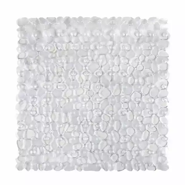 This transparent shower mat features a pebble pattern and suction cups to ensure extra safety and stability.
