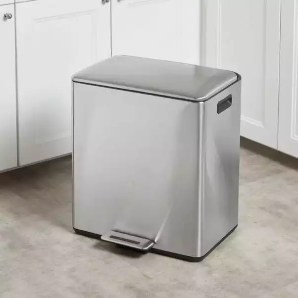 Recycling is made easy with this everyday family kitchen twin compartment bin with two large (15/25L split) will help you easily separate your recycling and household waste while look great in any kitchen space. This recycling bin has a total 40-litre capacity and pedal operation for hygienic use. Made with a stainless-steel finish and a high-quality metal exterior finish. Built with a soft close mechanism to ensure a soft and silent action. Includes 2 removeable inner buckets for ease of emptying and cleaning.