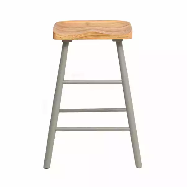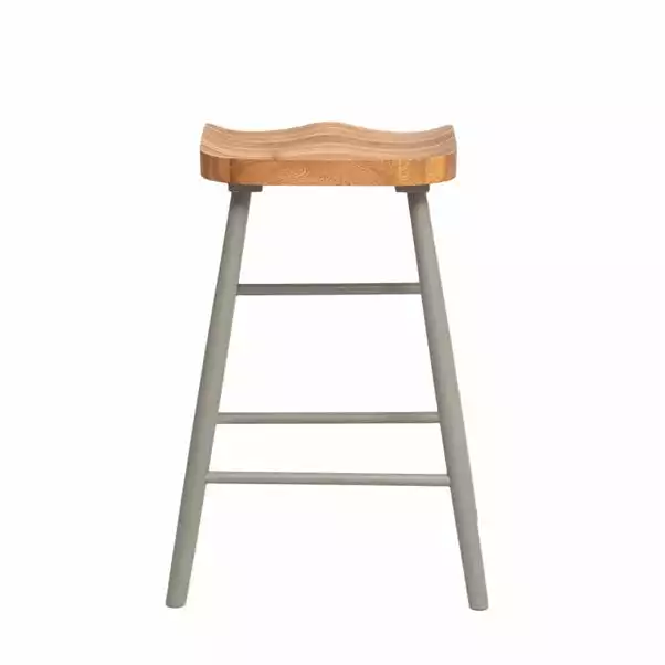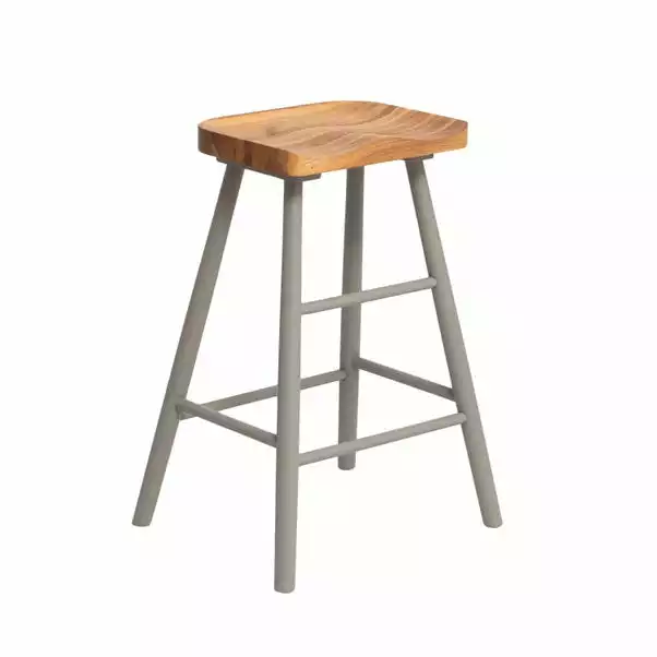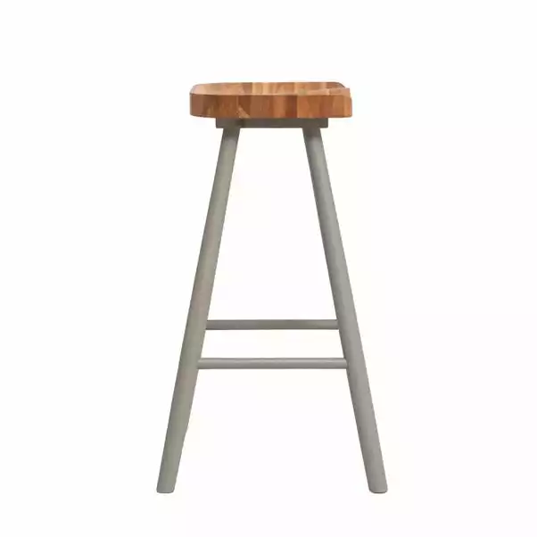 Crafted from 100% solid oak, the Alaina bar stool offers a timeless style and would suit a variety of interior styles. Complete with a moulded seat for added comfort, this versatile, part assembly stool features a natural finish and grey painted legs, with a crossbar footrest and is the perfect height to suit standard UK counter tops.