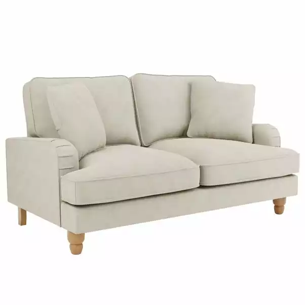Bringing a modern touch to a timeless vintage style, the Beatrice two seater sofa would make a wonderful addition to any home. This sofa is upholstered in an undeniably soft polyester fabric, complete with a pleated arm design and piped edge detailing. Finished with turned rubberwood legs in a natural finish, this sofa offers a stunning design that would bring a touch of sophistication and elegance to any room. As well as being undoubtedly stylish, the Beatrice is comfortable too, crafted with foam and fibre filled seats and a webbed and sprung base to provide optimal support, as well as plush fibre filled back cushions and two matching scatter cushions.