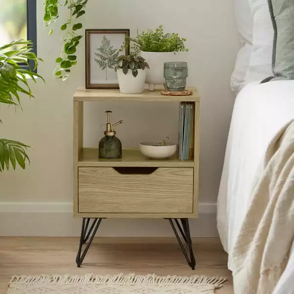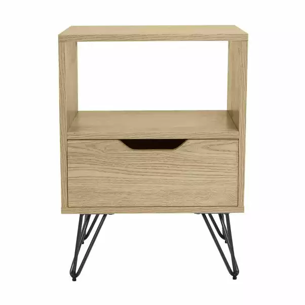 This Bella 1 Drawer Bedside Oak Effect is a great place to store your bits and bobs. The oak effect finish and black metal hairpin legs add a classic look that will complement any room in the house.