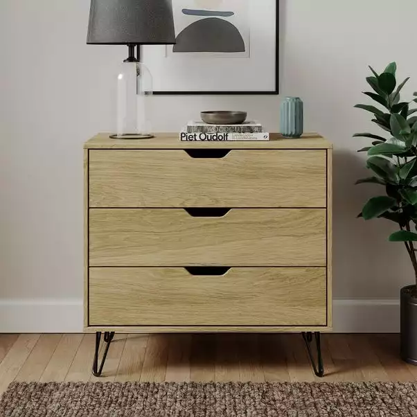 The Bella 3 Drawer Chest Oak Effect has it all, from the classic hairpin leg design to 3 spacious drawers and an oak effect finish, this is a beautiful addition to your bedroom and will look great with any colour scheme.