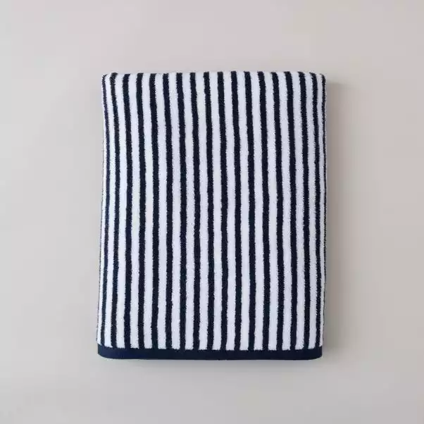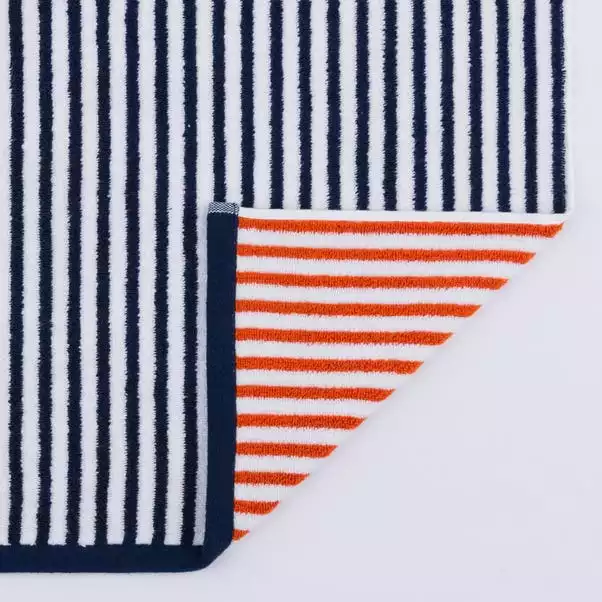 A navy striped front features a bright burnt orange reverse, perfect for adding a pop of colour into your bathroom. Coordinate this bright and bold modern stripe design with our colour matching Egyptian towel range to create your unique style. Crafted from 100% Cotton, this design is available in three sizes and a range of beautiful colours.