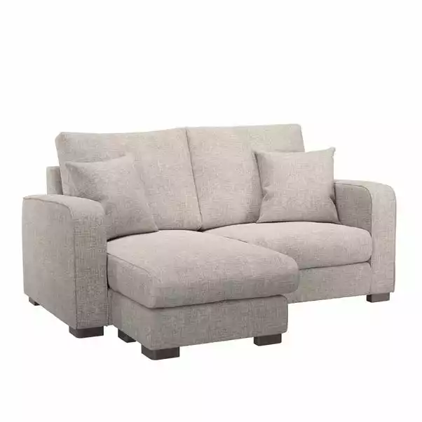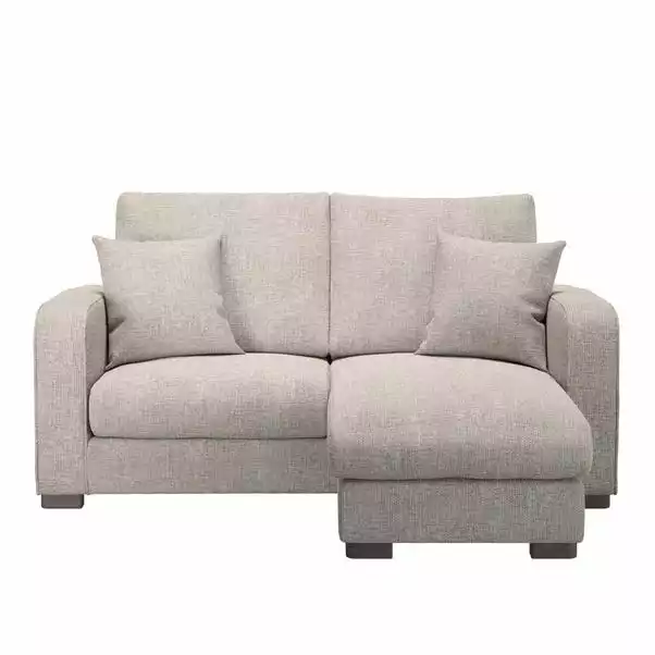 Designed with comfort in mind, the Carson Small Corner Chaise would make a welcome addition to any home and is especially ideal for smaller living room spaces. It comes with an adjustable footstool so that you can easily move it to the left seat or right seat to create a chaise. Boasting sprung, foam-filled extra deep seats, and fibre-wrapped foam back cushions, this sofa is the perfect place to sink back into after a long day. This stylish sofa features soft and hard-wearing chunky chenille upholstery and styled with a piped edge detailing and complementing dark wooden feet for a sophisticated look. This sofa also features removable cushion covers for easy care, and is supplied with two matching scatter cushions.