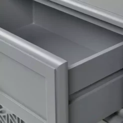 Offering ample storage space with two drawers and two carved door cupboards, this fully assembled sideboard features an grey painted finish and dark round handles.