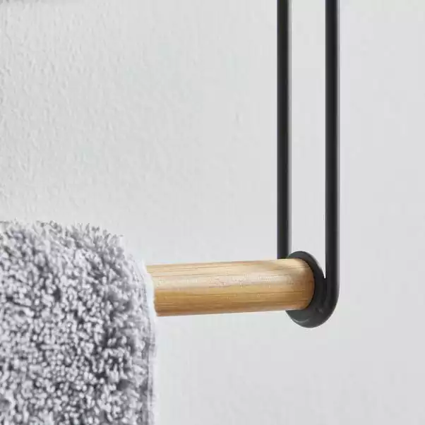 Boasting a simple yet stylish design this compact living towel rail with a shelf keeps your bathroom accessories neat and tidy. Beautifully crafted from durable metal and natural bamboo, this towel rail shelf is durable and easy to wipe clean. This towel rail shelf includes fashionable matt black wire detailing for a contemporary feel.
