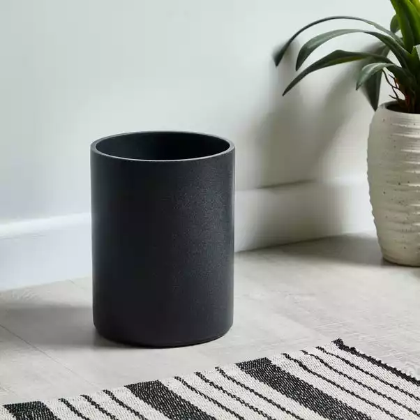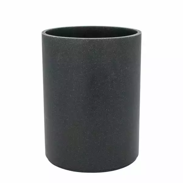 Made from durable polyresin in a dark grey shade, this cylindrical bin features a subtle speckled design.