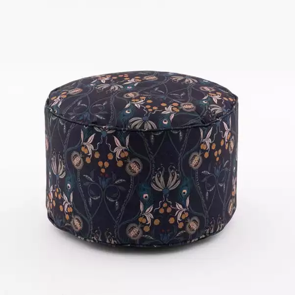 Our Havisham pouffe in a contemporary navy colourway features a printed design reminiscent of the beautiful designs of the arts and crafts movement. Made from a brushed woven fabric and finished with a stylish piping detail around the edge, this round pouffe is lightweight and durable. Use as additional seating, a footstool or as a side table to rest your tray on. Many other coordinating items available from our Havisham collection.