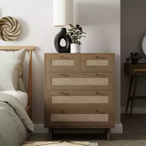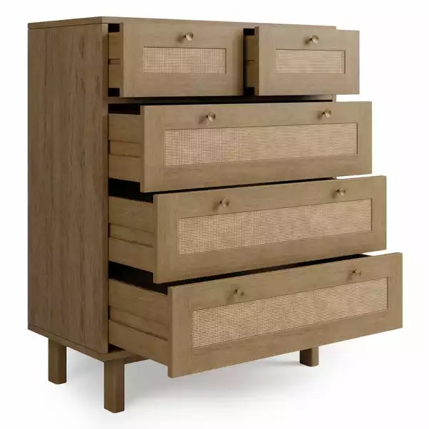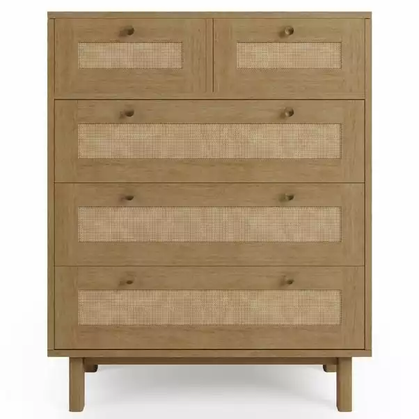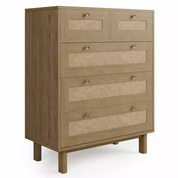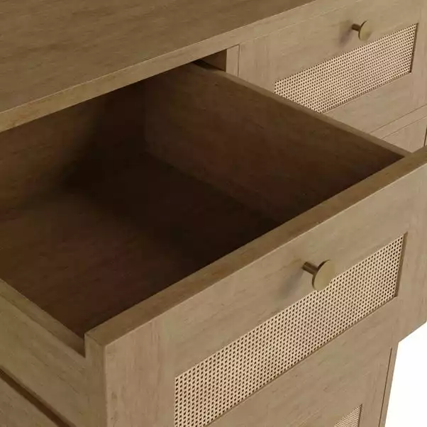 Bringing a modern flair to a retro style, the Indi range is perfect for any contemporary or global styled home. Characterised by the stunning rattan fronts and brass knobs, this range boasts a 100% mango wood construction and minimal assembly. Perfect for bringing a warm neutral feel to your home, this stunning 5 Drawer chest provides space to keep your bedroom organised and clutter-free. Crafted from sturdy, solid mango wood, this piece is built to last.