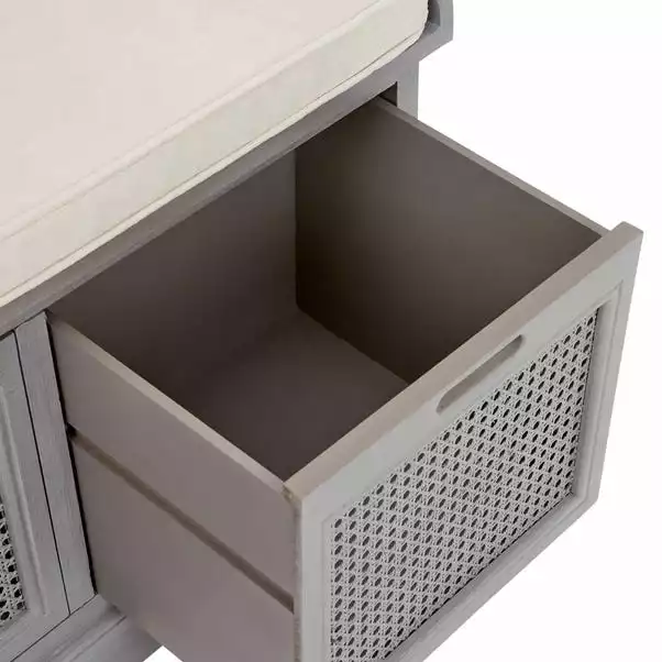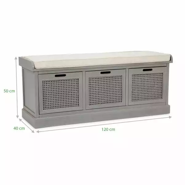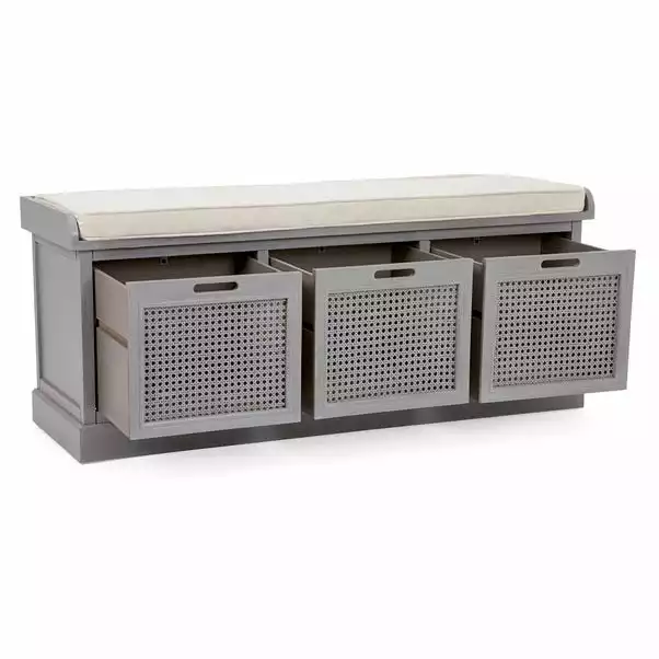 Featuring three large drawers with cut-out handles and cane webbing design, this fully assembled storage bench offers a padded seat cushion top and a slate grey colourway with an aged painted finish.
