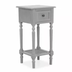 Featuring a slate grey colourway with an aged painted finish, this part-assembly telephone table is crafted from solid wood and offers one small drawer complete with a round handle and a low cane webbing shelf to boasts extra storage space.
