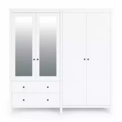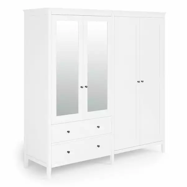 The Lynton 4 Door Wardrobe is a perfect solution for those who need more storage space in their bedroom. This wardrobe has 2 hanging rails and 2 large drawers, providing more than enough space for dresses, suits, folded clothes, accessories, shoes, and other items. This Lynton wardrobe has 2 mirrored fronts and has a timeless painted finish to look stylish for years to come.