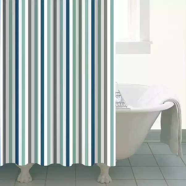 Designed with a wide striped pattern in nautical blue hues, this eyelet shower curtain is made from durable materials with a weighted hem to hang elegantly on your curtain rail.