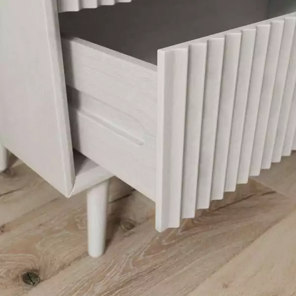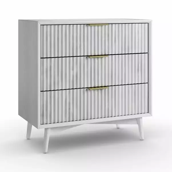 If you’re looking for a chest of drawers that’s as stylish as it is practical, then you’ll love this Neena 3 Drawer Chest! The white wash painted finish and champagne metal handles provide a chic and modern look, while the fluted front design and angled legs bring a hint of retro charm. With this chest of drawers, you’ll have plenty of space for your clothes, but you won’t be sacrificing style!