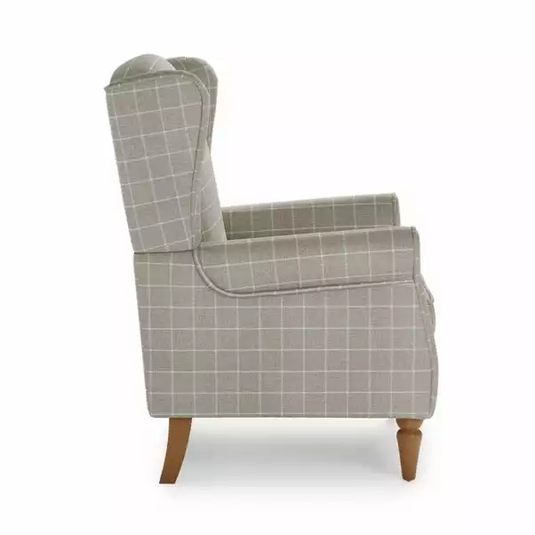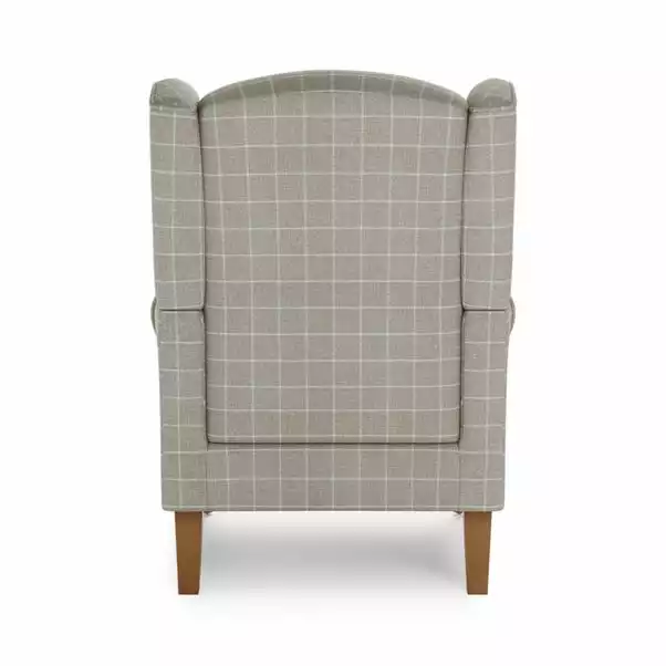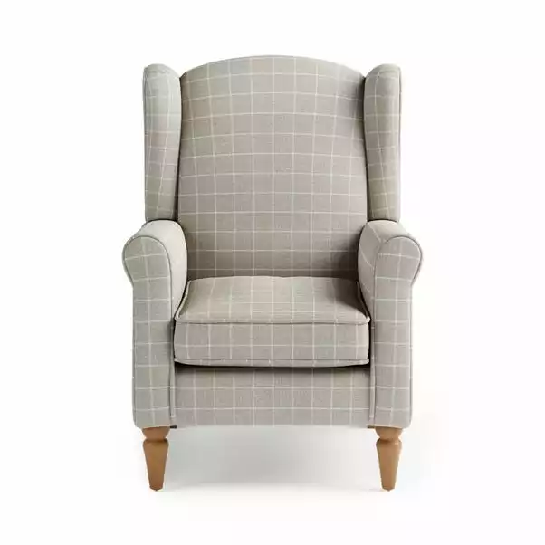 Designed with comfort in mind, the Oswald armchair is upholstered in a smooth, window pane checked, woven fabric in a choice of natural and grey colourways and crafted with foam and fibre filled cushions. The pocket sprung seat and high back provide plenty of additional support, whilst the classic wingback design with scrolled arms, piped edge detailing and sturdy, oak finished wooden legs complete the look. The Oswald armchair is also available in a range of different colours, fabrics and sizes and offers easy assembly; just attach the feet and you’re ready to relax.