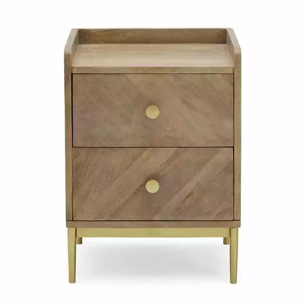 Give your bedroom an instant uplift with Rumi, our mid-century inspired bedside. The chevron wood grain drawer fronts and contrasting brass effect finishing touches give Rumi an art-deco edge, perfect for modern, retro and mid- century styled homes. The two drawers provide plenty of space to store away any items you need within reach – books, chargers, face creams, remotes. Rumi is made from solid mango wood, ensuring this bedside will be strong and sturdy for years to come.