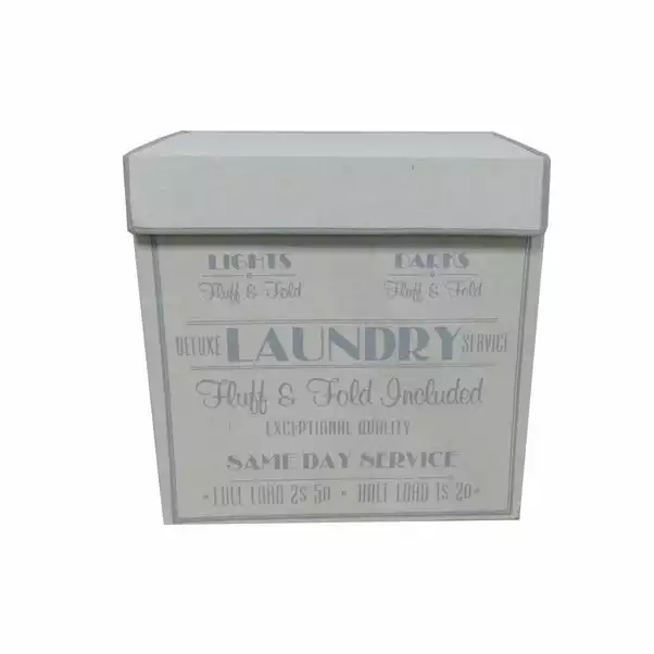 Designed in a grey tone complemented by vintage styled typography, this laundry basket is made from hardwearing materials and includes a lid.