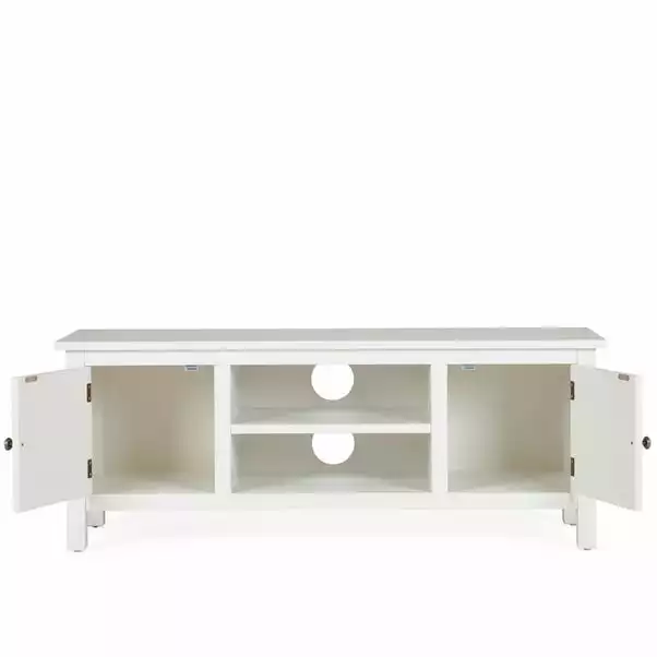 Finished in a white colourway, the Samira TV stand features two open shelves, each with a large cable aperture for ease of use as well as two ample sized cupbpoards.
