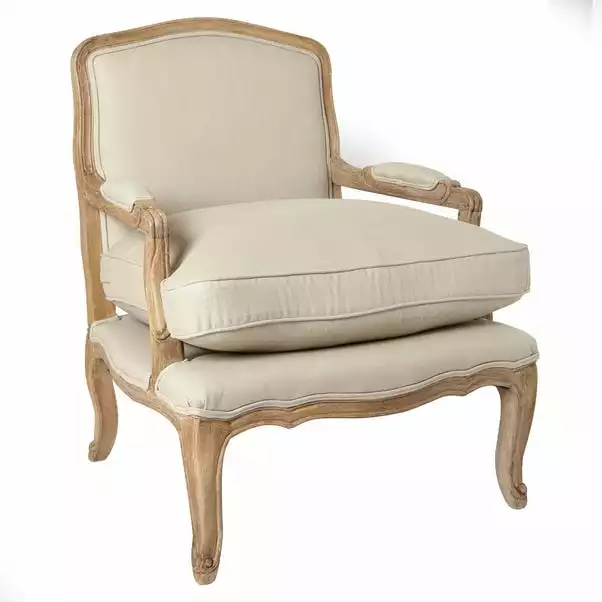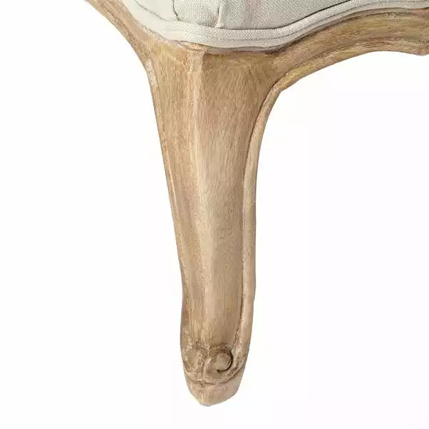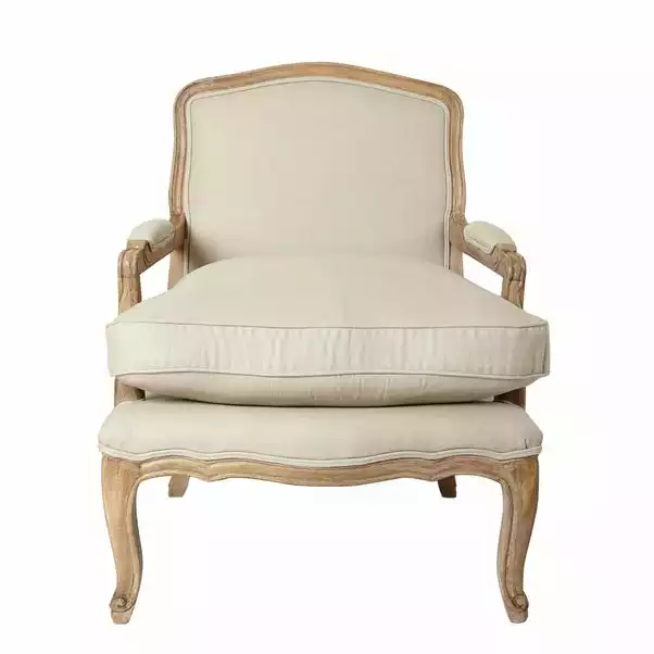 Designed with plump foam cushioning and comfortable armrests, this occasional chair is upholstered with cream linen fabric and is finished with scrolled feet and elegant curving detail.