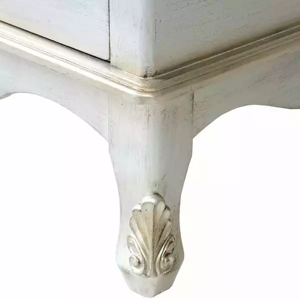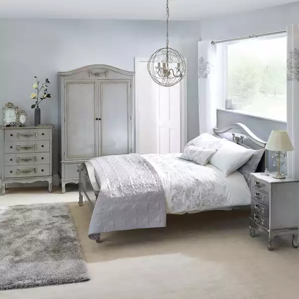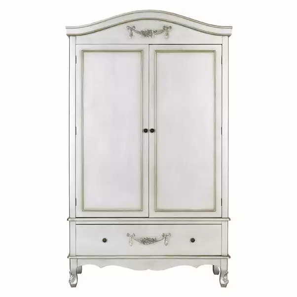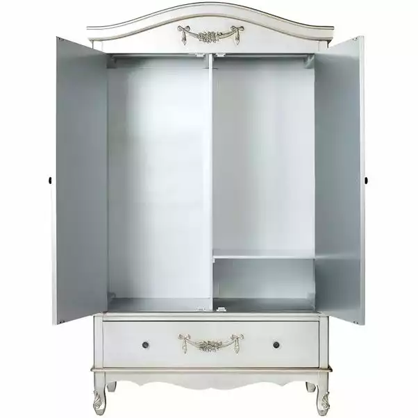 Featuring a French-inspired design with ornate floral detailing, the Toulouse range boasts a vintage look, with a choice of antique silver and distressed off-white finishes. Featuring curved legs, this self-assembly double wardrobe will add an elegant touch to any room.