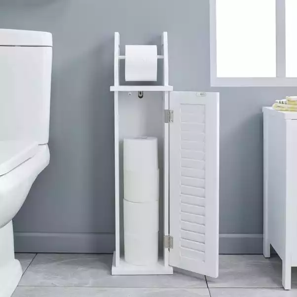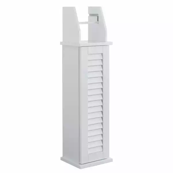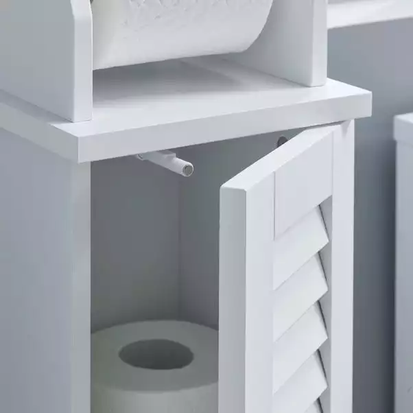 Designed with a contemporary white finish, this toilet roll storage unit from the Tuscany bathroom collection has been designed with a toilet roll holder on the top and features addition storage space underneath with a hinged slatted door design, perfect for keeping your spare toilet rolls in an easy to access place.