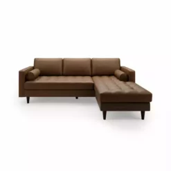 Bring some modern retro styling to your living room with the stylish Zoe Right Hand Corner Sofa. Finished in a trendy colourway, this sofa features durable and easy to care for PU leather upholstery, styled with a gorgeous tufted seat cushion, piped edge detailing and stylish tapered solid wood legs. As stylish as it is comfortable, the Zoe corner sofa is the perfect place to sit back and put your feet up, featuring a foam filled, sprung seat and fibre filled back cushions, as well as two matching bolster cushions to boot. This corner sofa has non-reversible back cushions and fixed seat cushions.