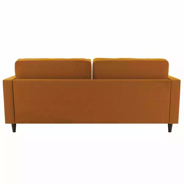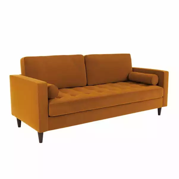 Bring some modern retro styling to your living room with the stylish Zoe 3 Seater Sofa. Available in a choice of bright and trendy colours, this sofa features soft touch velvet upholstery, styled with a gorgeous tufted seat cushion, piped edge detailing and stylish tapered solid wood legs. As stylish as it is comfortable, the Zoe is the perfect place to sit back and unwind, featuring a foam filled, sprung seat and fibre filled back cushions, as well as two matching bolster cushions to boot. Made with recycled materials. This sofa has non-reversible back cushions and a fixed seat cushion.