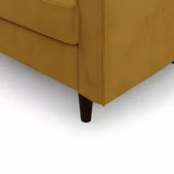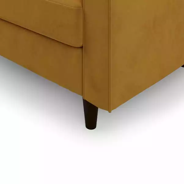 Bring some modern retro styling to your living room with the stylish Zoe Left Hand Corner Sofa. Available in a choice of bright and trendy colours, this sofa features soft touch velvet upholstery, styled with a gorgeous tufted seat cushion, piped edge detailing and stylish tapered solid wood legs. As stylish as it is comfortable, the Zoe corner sofa is the perfect place to sit back and put your feet up, featuring a foam filled, sprung seat and fibre filled back cushions, as well as two matching bolster cushions to boot. Made with recycled materials. This corner sofa has non-reversible back cushions and fixed seat cushions.