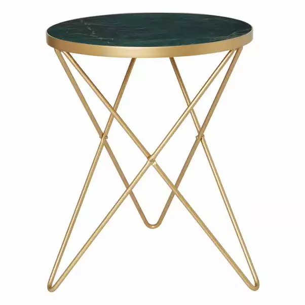 The contemporary and luxe design of the Zoey Marble Effect Side Table instantly adds an elegant feel to your home. Featuring a marble-effect green top made of tempered glass and finished with gold-effect hairpin metal legs, this compact yet practical side table is ideal for use in any room and is sure to be a new favourite in the home.