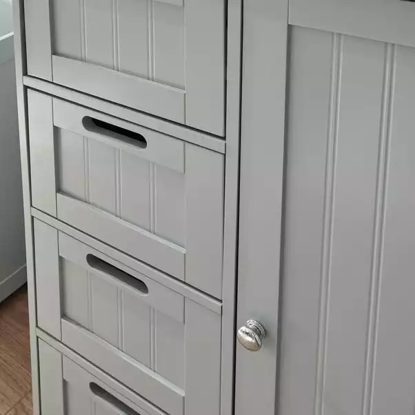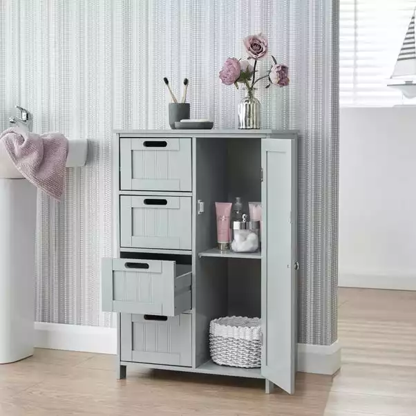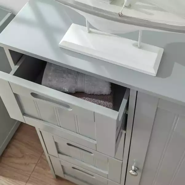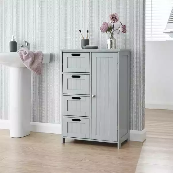An elegant yet functional addition to your home, this self-assembly bathroom storage unit is ideal for keeping your home tidy and organised. With a contemporary white finish this solid pine storage unit will give you plenty of room to store away bathroom essentials with four large drawers, and a cupboard with a storage shelf inside. It will look good in any home with its simple style and is both functional and durable, made with a solid construction.