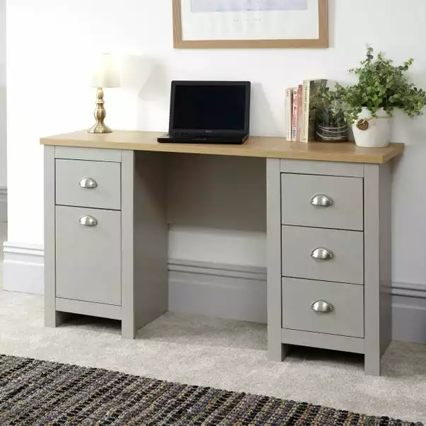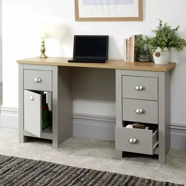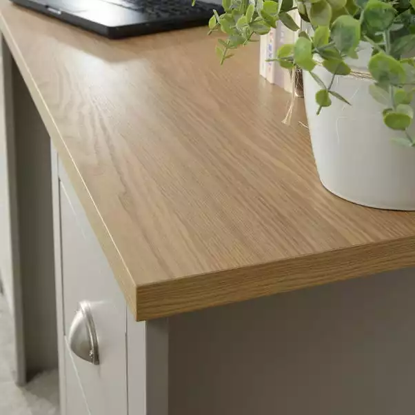 Designed in a contemporary country style, the Lancaster study desk is available in a choice of stylish grey or cream colourways with a contrasting oak veneer top and would be a great addition to your home. This self-assembly desk features plenty of storage, with four ample sized drawers and a handy cupboard space, complete with signature satin silver finished drawer handles.