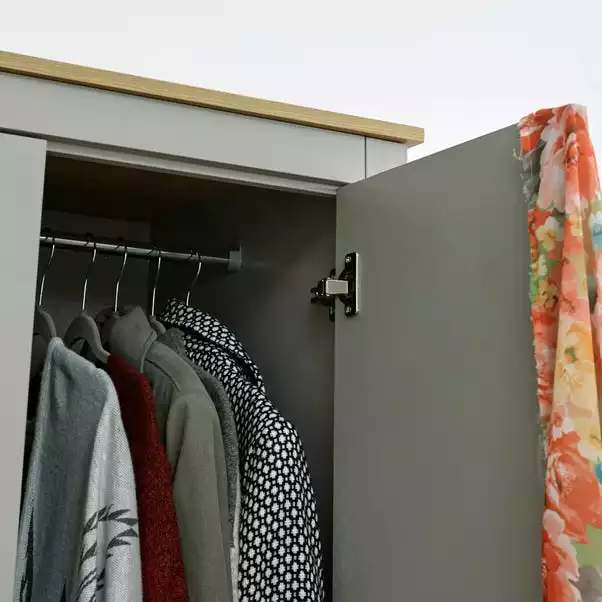 The Lancaster Triple Wardrobe boasts a stylish shaker-inspired design that’s perfect for kitting out a bedroom in first-class style. The sleek lines, soft grey or cream foiled finish with oak-effect tops and brushed steel handles create a sophisticated impression. The wardrobe provides effective storage with a good mix of hanging, drawer and shelf space – Ideal for a room where understated elegance is the goal.