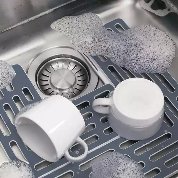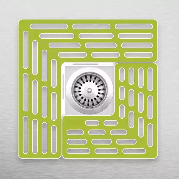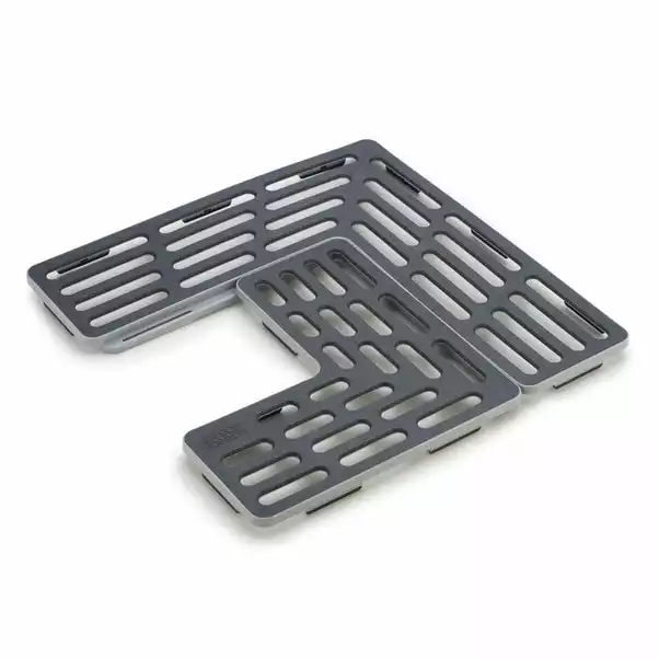 Designed to safeguard sinks from scratches and chips, this grey Joseph Joseph adjustable sink saver adjusts to fit different plug positions and locks neatly together and benefits from a manoeuvrable surface allowing water to drain and air to circulate quickly and efficiently.