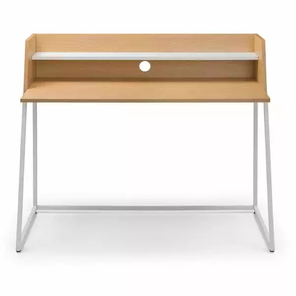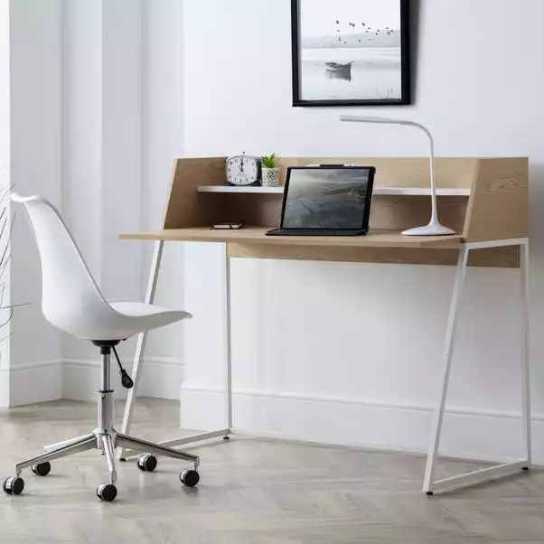 Featuring a simplistic and functional design, perfect for adding a modern touch to any home office space. The Palmer Desk offers a large surface area for your laptop and paperwork, along with an additional shelf to keep your stationery organised. This desk offers a space for your wires to sit neatly down the back of the desk, allowing you to keep your workspace tidy. The Palmer Desk is finished in an oak effect with a contrasting white shelf and legs, this desk suitable for a wide range of décor styles.