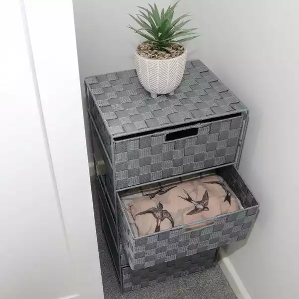 Fulfil your home storage needs with JVL’s Vichy range and this versatile storage tower constructed with a strong but lightweight decorative weave design. This attractive and practical storage tower comes with four drawer compartments that are perfect for organising items anywhere in the home or office and keeping as jewellery, toiletries, stationery and small garments contained. The wide structure, durable wire frame and steel grey colour will bring decoration and practical storage to your space.
