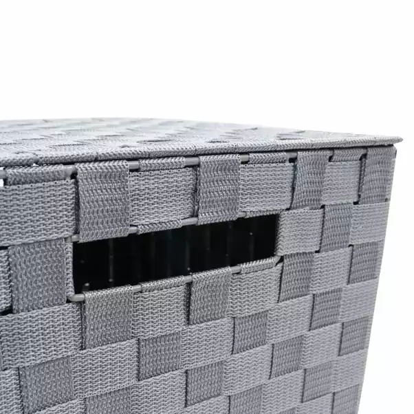 Upgrade your home storage with the Vichy storage collection to add style and functionality to your home. With its neutral steel grey colour and sturdy fabric weave. Perfect for storing your laundry and keeping your space organised, the spacious design can accommodate a family’s wash load, making it ideal for use in the bedroom, utility room, or children’s bedroom. The open handle spaces on either side make it easy to transport your laundry to the laundry room and this versatile hamper is also ideal for students in college or university, where space is limited.