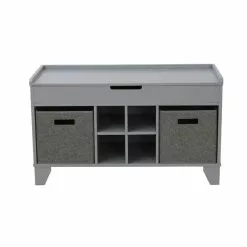 Designed from painted MDF, this hallway ottoman has been finished in a modern grey colourway suitable to compliment all types of decor and features two practical felt baskets for convenient, neat space saving storage. Finished with four open shelves and an opening lid for extra useful storage, this hallway ottoman boasts soft close hinges on the lid for sleek closing. Supplied with a one year guarantee.
