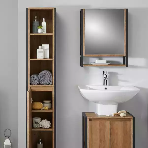 Boasting an oak effect and black metal frame this Tall Cabinet gives your bathroom an ultra-modern touch whilst also proving you with ample storage space. With three display shelves, you can display all your favourite toiletries, ornaments, plants or bathroom essentials whilst its two internal shelves mean you can neatly and discreetly organise all your other bathroom bits and bobs. This Tall Cabinet features a handle-free design and 6 shelves for ample storage space. This door opens from right-left.