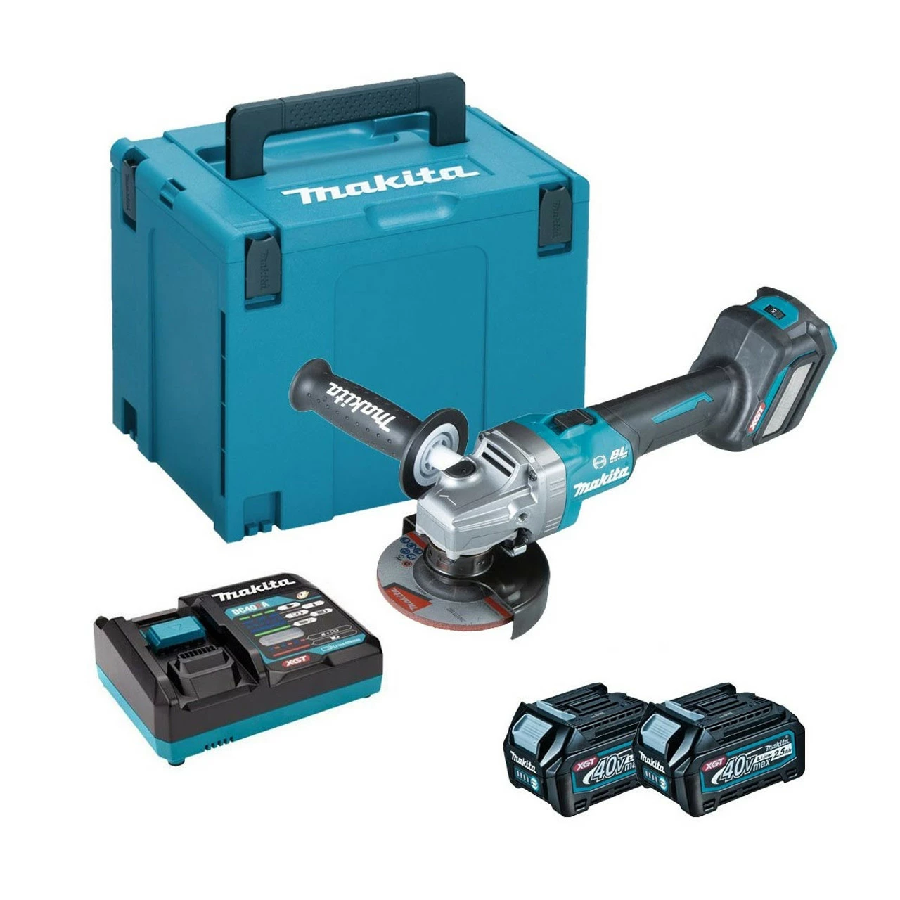 The GA022GD201 is supplied with 2x 2.5Ah 40V batteries, a DC40RA fast battery charger, a Makpac Type 4 connector case, a side handle, a grinding wheel, and a lock nut wrench.