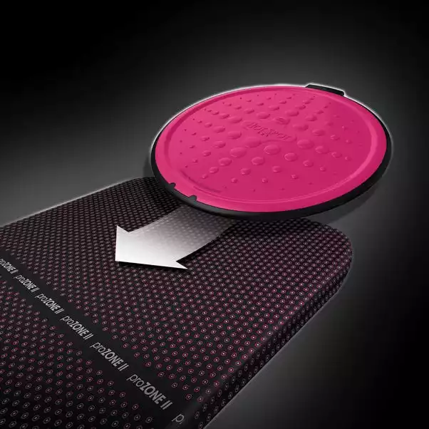 Featuring solid loop legs, this Minky black ironing board includes a pink bespoke pro zone cover with metallised dots to reflect the heat to help provide a crease free finish and a movable silicone rest for your iron.