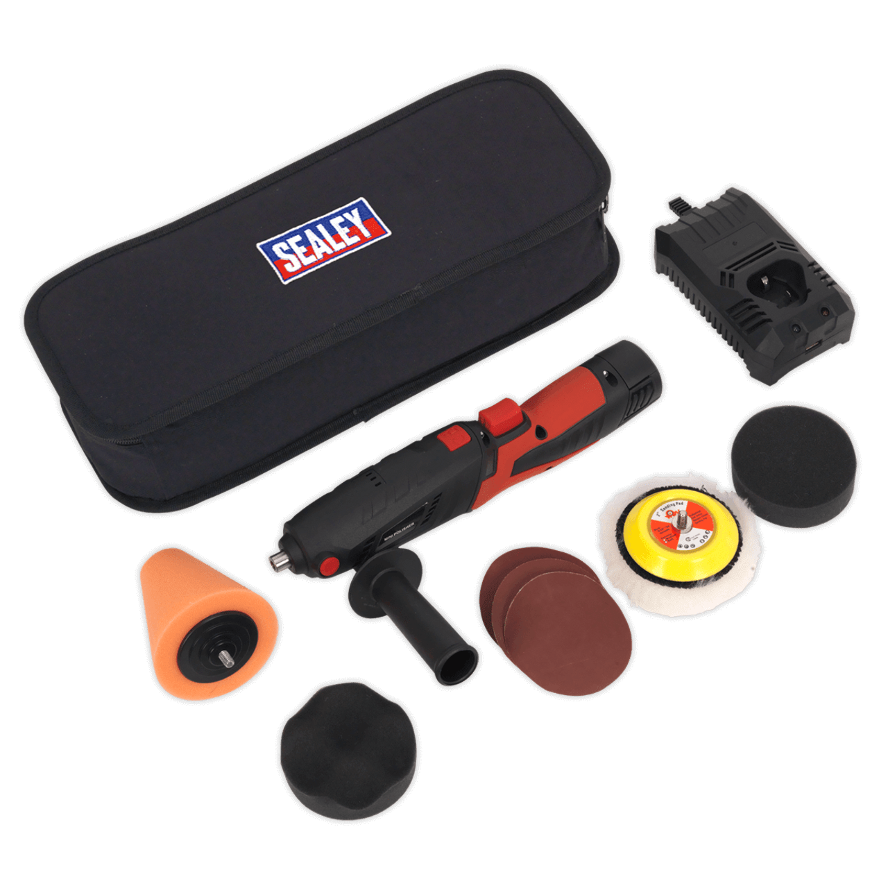 Features variable speed control giving a range suitable for sanding and polishing up to 3000rpm. Soft grip handle for comfort and control. Locking swivel adjustment from pistol to straight type. Includes battery condition indicator. Supplied in canvas bag with 12V Lithium-ion battery pack, battery charger and a range of polishing and sanding heads.