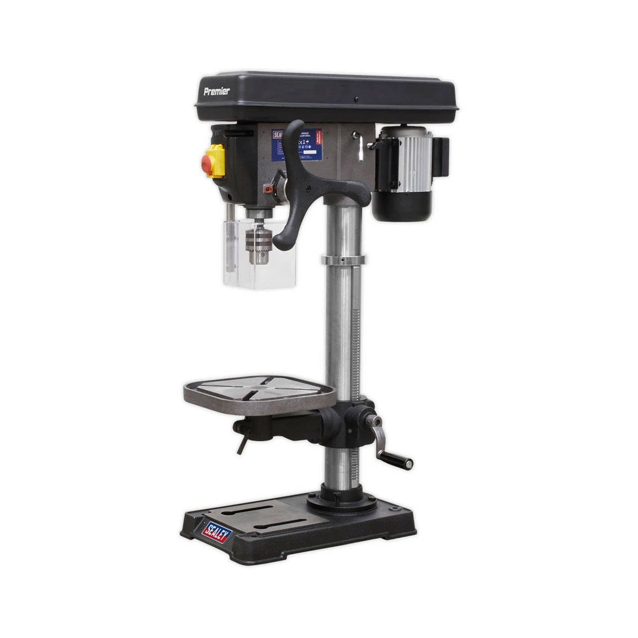 One of a comprehensive range of Premier bench mounting pillar drills for the professional workshop. Features heavy-duty aluminium-bodied motor for long and reliable performance. No-volt release switch to prevent inadvertent start-up and pulley cover protected by microswitch to prevent drill operating when cover is open. Fitted with an integral work light which illuminates the drilling table giving operator a clear view of the drilling process. Supplied with an electrically inter-locked chuck guard. Large sized square table fitted with precision rack and pinion height adjustment.