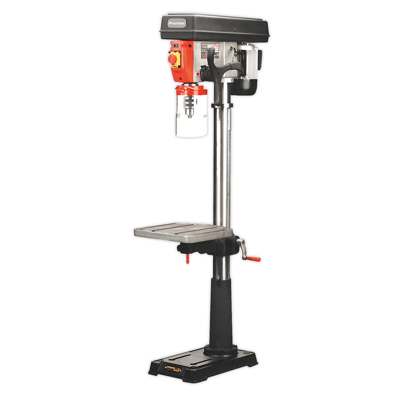 One of a comprehensive range of Premier floor standing pillar drills for the professional workshop. Features heavy-duty aluminium-bodied motor for long and reliable performance. No-volt release switch to prevent inadvertent start up and pulley cover protected by microswitch to prevent drill operating when cover is open. Fitted with an integral work light which illuminates the drilling table giving operator a clear view of the drilling process. Supplied with an electrically inter-locked chuck guard. Large sized square table fitted with precision rack and pinion height adjustment.