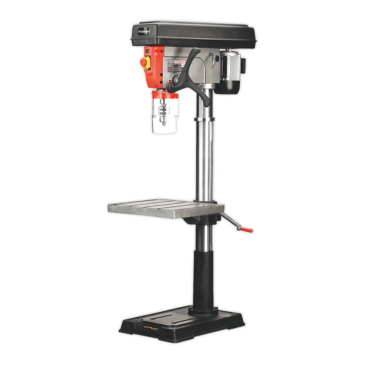 One of a comprehensive range of Premier floor standing pillar drills for the professional workshop. Features heavy-duty aluminium-bodied motor for long and reliable performance. No-volt release switch to prevent inadvertent start up and pulley cover protected by microswitch to prevent drill operating when cover is open. Fitted with an integral work light which illuminates the drilling table giving operator a clear view of the drilling process. Supplied with an electrically inter-locked chuck guard. Large sized square table fitted with precision rack and pinion height adjustment.