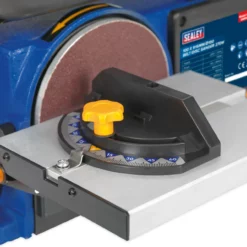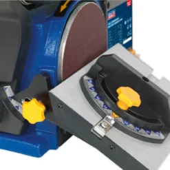 - The sanding disc table can be tilted to any angle up to 45°, and is supplied with a mitre gauge for accurate angle sanding
