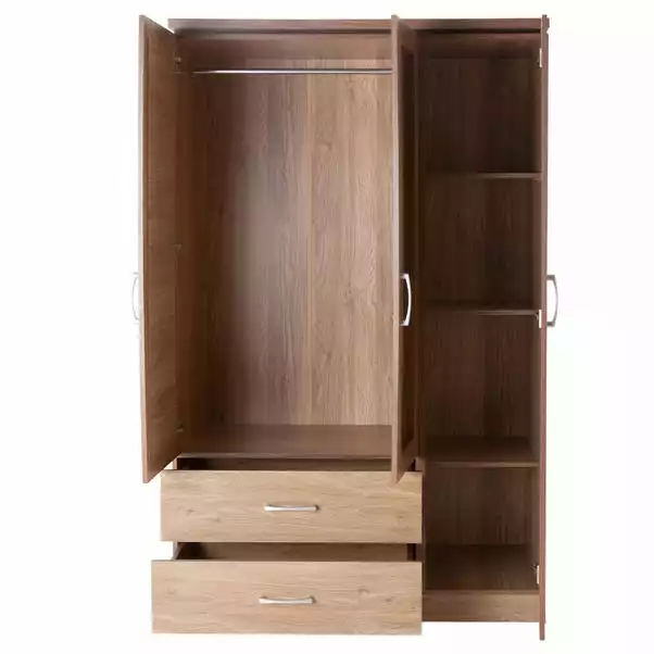 Simple yet stylish, the Charles Triple Mirrored Wardrobe features 2 spacious cupboards, 2 drawers and a handy mirror, making it a great functional piece for any bedroom. This sturdy wardrobe is available in a choice of glossy and natural oak veneer finishes with contrasting silver coloured handles. The cupboard features two hanging spaces, and two spacious drawers.